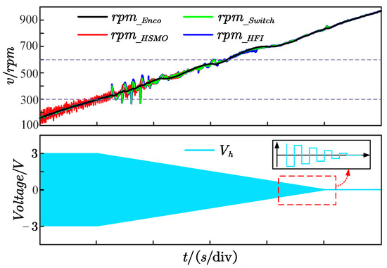 In addition, Figure 14 further shows the speed–response curve and the injection signal withdrawal process under the observer switching scheme based on linear weighting. Here, , , and represent the electrical speed from the encoder, HFI, HSMO and linear weighting, respectively. Above all, Figure 14 indicates that smooth switching between observers is achieved with linear weighting. Meanwhile, the identification performance cannot be affected during the linear exit of the injected signal. Most of all, the jitter is generally eliminated by the filtering function as it enters the medium-speed domain, which results in a smoother actual speed .
