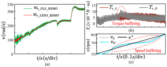 Finally, the effects of LESO, the linear weighted switching strategy and the injection signal linear exit scheme are verified in Figure 15. Here, is denoted as expected value. It proves that the LESO has better identification capability than the PLL under the same observer bandwidth. Even when the motor is in a steady state, the LESO can reduce at least 50% of the chattering amplitude. Moreover, Figure 15b,c compares the torque and speed response performance under the linear exit and direct exit modes of the injected signal, respectively. The experiments where the injected signal exits directly and linearly are further performed; their results are shown in Figure 15b,c. Note that the way in which the injected signal exits directly creates spikes in torque jitter that cause larger fluctuations. In contrast, the way that the injected signal exits linearly can suppress torque chattering peak and speed fluctuation, which further improves system stability.