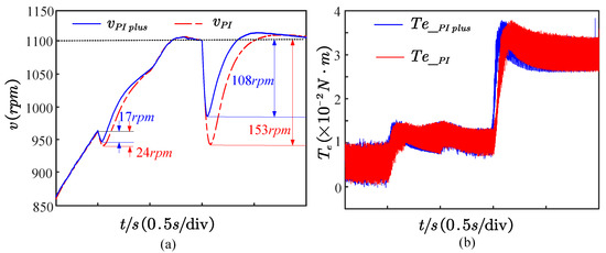 In order to further verify the performance of the PI plus speed controller, a comparative experiment on resistance to load disturbance is performed, and its corresponding results are shown in Figure 16. Here, a constant load with 0.01 is applied to the motor during uniform acceleration. From Figure 16a, it is clear that the speed drop is reduced by approximately 7 rpm compared with the traditional PI. Therefore, the PI plus controller can effectively reduce the speed drop by comparing it with the PI control with consistent load disturbance.