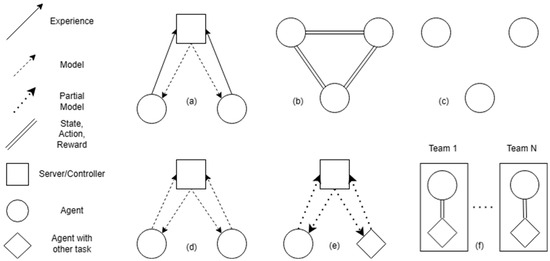 Figure 1. Distributed RL frameworks, where the communication between components is visualized. (a) CTDE; (b) FDC; (c) FDI; (d) HFRL; (e) VFRL; (f) TeamL. - Fully decentralized communicating agents (FDC). Agents are trained locally on each node and information is exchanged in some form between agents, such as the state and action of other agents or a global reward. Learned communication is another variant, where agents learn what sort of information to transmit. See Figure 1b.