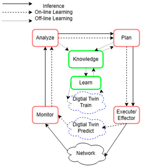 In more detail, the first enabler, the AI plane (or Network Intelligence (NI) plane as is alternatively referred to) establishes the AI workflows necessary for AI models lifecycle management and closed-loop control. Based on recent work (see [10,65] and references therein), the management of Network Intelligence, essentially a composition of AI models achieving a shared goal, will be organized in small parallel control-loops responsible for inference, offline and online training. These control-loops are broken into steps that can be expressed in terms of the so-called monitor–analyze–plan–execute based on knowledge (MAPE-K) framework (depicted in Figure 2, which is described in detail later in this section, when discussing the interplay of the three enablers). Crucially, NI should be able to coordinate with other NI instances towards promoting composability, in alignment with the respective criterion of Section 3. However, a trade-off between creating manageable end-to-end workflows and achieving scalability arises, since NI must operate within a certain timeframe and network scope that constrains the amount of time and information available for training. Training will be triggered either by a new phase of planning, in order to deploy updated models, or when a failure occurs or is predicted to occur.