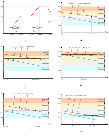 The BESS DC/AC converter operates in voltage mode with a droop control coefficient set to zero. However, the frequency is varied as a signalling mechanism to control the other units in the system [24]. The output frequency of the BESS unit is given by , and the SoC determines the deviation in frequency , according to Figure 2a. When the SoC is between and , the frequency deviation . During this period, there is no need for export/import or curtailment/supplement. As the SoC increases, the frequency deviation increases until the SoC reaches where saturates. A similar trend exists for low SoC: when , the microgrid should export power to the rest of the system but with no PV curtailment. When , the microgrid should curtail PV and export to the rest of the network. When , the microgrid should import power from the rest of the network but with no supplement from the auxiliary unit. When , the auxiliary unit should supplement the microgrid power and import power from the network.