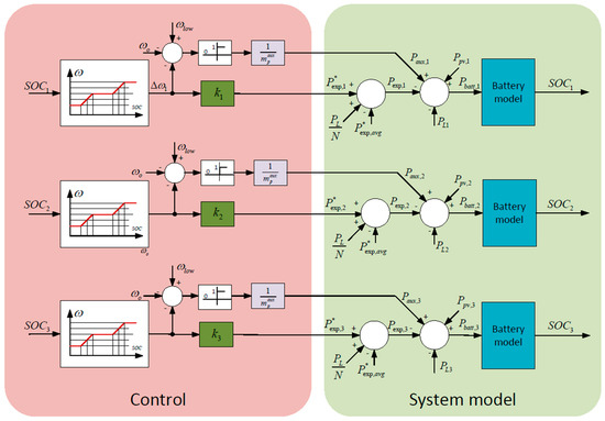 The expression in Equation (13) shows that if all units have the same power setpoint, all units will supply the global load equally and there will be no power exchange between the microgrids. It also shows that each unit will supply its portion of the global load plus a term equal to the difference between that unit’s power setpoint and the average of all setpoints . Additionally, if the average of all setpoints is greater than , the microgrid will import rather than export power. The above equations are represented in Figure 3 which shows the system model and its high level controller.