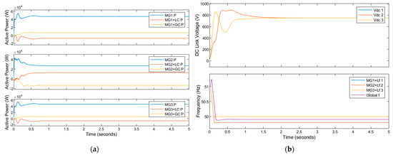 Figure 4a shows simulation results of interconnected microgrids operation at 50 Hz, 49.80 Hz, and 50 Hz frequencies and loads of 40 kW, 25.8 kW, and 40 kW for microgrids one, two, and three, respectively. The variation in frequency in microgrid two reflects a power shortage of about 14.2 kW. The power shortage in microgrid two is equitably supplemented with 7.1 kW of power each from microgrids one and three, respectively, following a frequency deviation below the nominal of microgrid two. The global frequency is maintained at 49.9 Hz against the different microgrid operations at a frequency deviation below the nominal of microgrid two. The varying nature of the different microgrid and global bus frequency values is shown in Figure 4b. Hence, the DC link voltage is controlled at 750 V, as seen in Figure 4b. However, the DC link voltage of the local converters for microgrid two reaches a steady state at about 1.6 s, while the global bus frequency is maintained at 49.90 Hz from about 0.6 s.