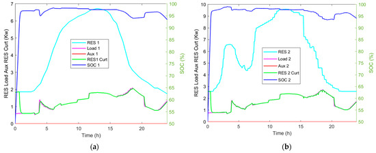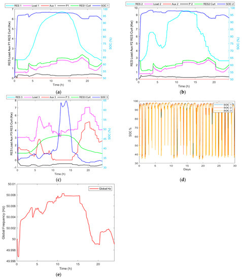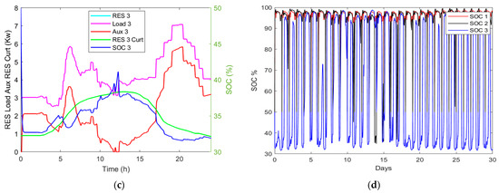 The first high-level simulation results represent the output response of three microgrids operated independently within a minimum and maximum SoC of 30% and 100%, respectively. Figure 5a shows the power output of the PV-based RES and the curtailed RES, the auxiliary unit, the SoC, and the load power of microgrid one. The general expectation from this simulation scenario is that any excess power should be curtailed, and priority should be given to the full utilisation of the PV-based RES to feed the load. In microgrid one, the RES power supply is greater than the load demand. The RES is used to supply power to the load, and the surplus from the RES is curtailed. The auxiliary unit does not supply any power and remains on standby as the battery SoC goes up to its full limit for the day. At about time t = 4 h, the SoC tends to decrease due to a slight increase in the load. At t = 19 h, the SoC reflects the gradual increase in load demand with a gradual slight decline. However, the battery power is provided at all times to balance the system as priority is given to full utilisation of PV-based RES, the SoC is high, and the auxiliary unit only supplies power when needed. Figure 5b shows the simulation result for microgrid two, which illustrates that the power generated from the PV-based RES exceeds the load demand. The auxiliary unit is on standby and does not supply any power as the battery SoC goes up to its full limit for the day. At about t = 4 h, the SoC slightly decreases due to a sharp increase in the load. At t = 19 h, the SoC reflects the gradual increase in load demand with a slight decline, which goes back up at t = 21 h. Figure 5c shows the simulation results for the third microgrid, indicating that the load demand is greater than the available RES power. The PV-based RES supplies its full capacity to the load, which is insufficient to meet the demand of the load, and the auxiliary unit supplies the difference to meet the load demand. The auxiliary unit starts to supply power at t = 0 h, as the battery SoC goes down to its low limit of about 32%. The available power from the PV-based RES is less than the load, and this caused the SoC to stay within its low limit, which triggers supply from the auxiliary unit. At about time t = 12 h, the SoC goes up and then down at t = 15 h, due to intersecting with the load demand and available RES curves, and at this point, the auxiliary unit supplies zero power. The auxiliary unit supplies power to meet the load demand for the rest of the simulation time. Figure 5d shows the 30 days simulation for SoC operated under different load and RES profiles, and the results illustrate that the SoC remains within its limits. The controller prevents the SoCs from exceeding their maximum and minimum limits.