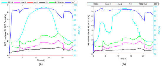 where represents the number of microgrids, is the battery power, is the PV-based RES power, is the auxiliary power, is the load, and is the power exchanged (import/export). The system parameters are described in Table 2.