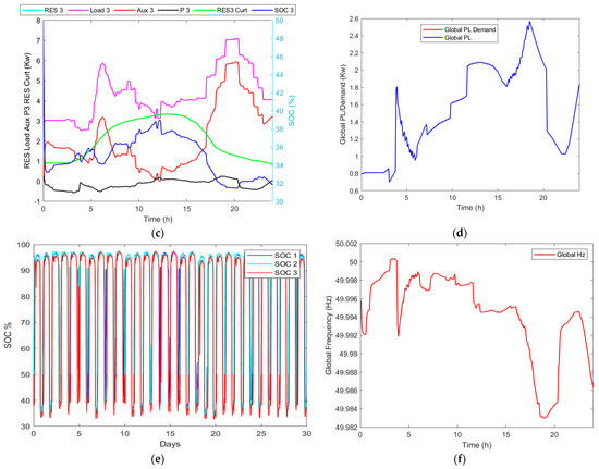 (a–f). Output responses for multiple microgrids interconnected with global droop controller and load for 30–100% SoC: (a) microgrid one, (b) microgrid two, (c) microgrid three, (d) global load, (e) SoC, (f) global frequency.