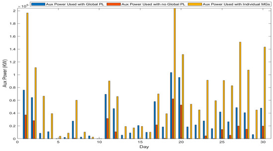 Figure 9 compares the auxiliary power utilisation for 30 days of simulation results and is evaluated based on the three operating scenarios. The results show that the highest amount of auxiliary power is supplemented daily when the microgrids are independently operated compared to when multiple microgrids are interconnected with the proposed global droop controller with or without the global load. The smallest amount of auxiliary power utilisation occurs when multiple microgrids are interconnected with the proposed global droop controller. However, there is a gradual increase in auxiliary power utilisation when the global load is connected to the global bus.