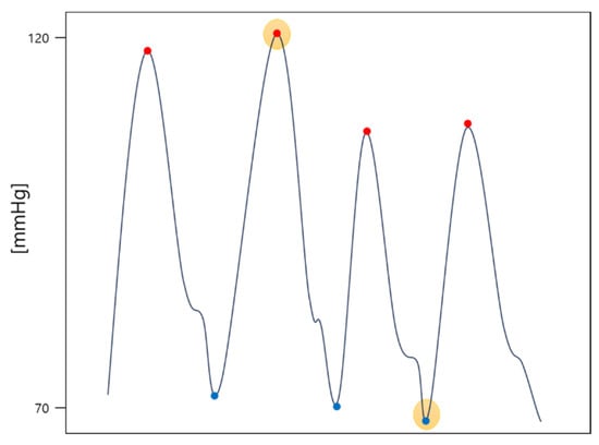 Example of selecting SBP (red dot with yellow highlight) and DBP (blue dot with yellow highlight) in an ABP signal (solid line).
