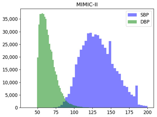 Systolic (SBP), Diastolic (DBP) blood pressure distribution of the MIMIC-II dataset used.