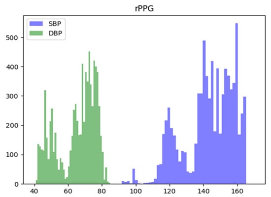 Systolic (SBP), Diastolic (DBP) blood pressure distribution of the rPPG dataset used.
