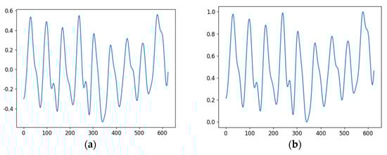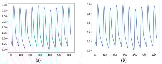 We did not perform any additional bandpass filtering. This is because blood pressure can be derived from other sources besides heart rate, so we normalized the signals as they are. We normalized each signal to the range [0, 1] to minimize the impact of inter-individual variation in PPG signals during model training. The equation used in the normalization process is shown in Equation (1):