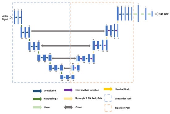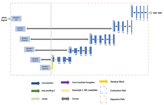 Model 3 is a model that predicts SBP and DBP from rPPG, and the model structure is shown in Figure 9. As can be seen from the Figure 9, the contraction path is the same as in Model 2. However, the problem with this is that it can cause overfitting of local features. Therefore, we added an additional inception residual block to the expansion path. This is a way to improve performance without significantly increasing the weight of the model, as it is less computationally intensive and faster than the traditional residual block. We froze the existing contraction path and proceeded with learning, setting the learning rate to 0.0005 and the epoch to 300.