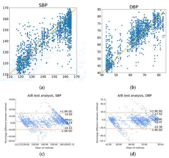Furthermore, there is inevitable degradation in performance due to the length of the data used, even if a similarly structured model is used. As mentioned earlier, if multiple applications use the RGB camera, its usability will reduce when it requires a longer duration of RGB image as input. We therefore compromised the performance in this aspect to enhance the effectiveness and efficiency of rPPG. In terms of rPPG, in Table 3, we can see that our model reduces MAE by 5.87 mmHg for DBP and 6.7 mmHg for SBP compared to the original study [16] before personalization, and reduces DBP by 6.37 mmHg and SBP by 5.8 mmHg after personalization. We can also see that our model reduces MAE by 3.66 mmHg for DBP and 4.64 mmHg for SBP compared to the later study [17] in 2022. Figure 10 provides a more detailed breakdown of each test prediction. In Figure 10a,b, scatter plots of SBP and DBP, respectively, with accurate values along the x-axes and forecasted values along the y-axes, demonstrate that points are moderately clustered around the line y = x. A more detailed illustration of this is provided using the Bland–Altman plots seen in Figure 10c,d. It can be observed that 95% of the examples fall within the interval [−10.12:14.50] for SBP and [−22.38:17.55] for DBP.