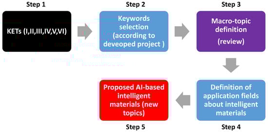 In the diagram of Figure 1 is sketched the methodological process followed to construct the proposed review. In Figure 2 is illustrated review framework based on the KETs-based research pipeline: the review is structured to discuss the elements concerning the six KETs, focusing the attention mainly on the possible new implementations of AI-based intelligent materials in electronic systems. The added value of the work is in hypothesizing new research topics based on AI, suggested by the analysis of the literature.