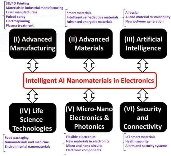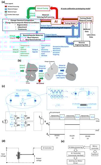 The European Commission has established research prioritizes and innovation support guidelines defining six Key Enabling Technologies (KETs) [1]. The KETs are considered as main research topics and are defined by the following application fields: (I) advanced manufacturing, (II) advanced materials, (III) life science technologies, (IV) micro/nano-electronics and photonics, (V) artificial intelligence (AI), and (VI) security and connectivity. The goal of implementing the KETs in industrial scenarios requires the improvement of the production of innovative materials according to the dynamic needs of the market and of life science research, both drivers of the research. In this scenario, AI has accelerated these needs, also introducing new, important solutions in industry and in medicine by addressing the production of intelligent materials. AI and electronics play an important role in terms of new approaches to control and to actuate a new production concept in order to realize new prototypes by trough nanotechnologies and smart materials [2]. The new frontier of production is to intelligently manufacture materials able to interpret stimuli and executing a self-response [3], or to optimize their synthesis to improve their physical and chemical properties. In this direction, it is important to find new circuital solutions to be integrated with innovative materials, thus allowing the implementation of intelligent embedded systems. The first stage in fabricating these intelligent materials is to define a new “proof of concept” according to the first two Technology Readiness Levels (TRL) [4] useful to classify research projects: TRL 1 (basic principles observed) and TRL 2 (technology concept formulated). The goal of the proposed review is to address the “proof of concept” for possible developments, including the strategy to include AI control in the material design, real-time stimuli control able to reconfigure and repair the material, material manufacturing, AI-based procedure tailoring and the tuning of specific “super-properties”, and the goal of realizing electronic embedded systems. The review proposes research topics to be considered for new research lines or for research projects by combining the multidisciplinary concepts of informatics, electronics, chemistry, and physics.