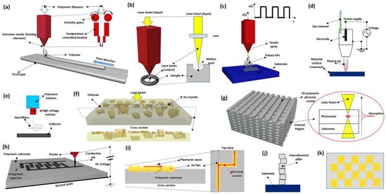 (a) Sketch of the FFF polymeric extrusion process and nozzle functions. (b) Laser beam subtracting or refining material surfaces. (c) Spray deposition technique controlled by electrical pulses. (d) Plasma technique for treatment of material surfaces. (e) Scheme of the electrospinning machine generating micro/nano-polymeric fibers. (f) Laser texturing effect on chitosan polymeric material forming Au metallic crystals in the bulk and on sample surface (3D model and related cross-section). (g) Two-photon polymerization technique realizing a 3D polymeric photonic crystal structure for optoelectronic filtering devices. (h) 3D printing conductive ink for the realization of electronic elements on a polymeric substrate. (i) Metallic spherical NPs textured or deposited to realize electrical conductive circuital link and plasmonic patterns (cross-section and top view). (j) Pillar-like self-assembled nanodiamond structure obtained by spray deposition technique suitable to locally concentrate the electrical current. (k) Au NPs’ textured patterns for artificial skin applications implementing plasmonic 2D patterns (top view). The figure summarizes the main fabrication techniques of polymeric-based nanomaterials and micro-/nanostructures for micro-/nanocircuits such as 3D photonic resonators, plasmonic resonators, and integrated electronic circuits.