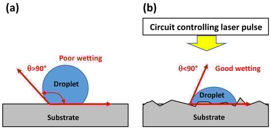 (a) Poor wetting condition. (b) Good wetting condition (rough surface) controlled by means of a circuit. The surface morphology could be controlled intelligently by a circuit varying, for example, the laser parameters generating surface roughness and, consequently, improving the surface wettability. The figure highlights the possibility to control the wettability by acting on the laser pulse. An example of laser pulse control is discussed in Section 9.