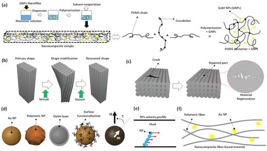 (a) Sketch of a nanocomposite sample formed by PDMS and GNPs and chemical procedure realizing the PDMS–Au material. (b) Example of shape memory dynamics of a material reacting to stimuli to reconfigure the initial shape after deformation (the control of the external stimuli could be performed by a driven electronic chip). (c) Example of material self-healing regenerating process of a surface crack. (d) Examples of NP typologies: metallic NP, polymeric NP, NP with an oxide layer as coating (NP encapsulated into an oxide coating), NP having a bio-functionalized surface, magnetic NP (torque τ of the magnetic moment m due to the application of an external magnetic field H). (e) NPs moving into a fluid from the channel surface to the middle region (NPs’ velocity profile). (f) Sketch of a nanocomposite electrospun polymeric fiber-based material (Au NP inclusion). The figure summarizes the main steps to realize a nanocomposite materials with GNPs, the reshaping and self-healing process, NPs of different materials, and their possible implementations in nanofluidic and nanocomposite fiber-based materials.