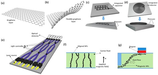 The advanced manufacturing approaches include different versatile techniques (see Table 1), such as 3D printing [6,7,8,9,10,11,12,13,14,15], 4D printing [16,17,18,19,20] (3D printing adding the time variable), innovative materials to be processed in actual industrial manufacturing processes [21,22,23,24,25,26,27,28], laser manufacturing [29,30,31,32,33,34,35,36,37], pulsed spray techniques [38,39,40,41,42,43], electrospinning techniques [44,45,46], and plasma treatments [47,48,49,50]. In Figure 3 are illustrated some graphical elements of the above-mentioned topics. An interesting research issue is to improve 3D/4D printing techniques by controlling extrusion. In particular, the fused filament fabrication (FFF) technique [6,7] could be AI-controlled by circuits to adjust locally nanomaterial deposition by means of the addition of filling nanoparticles (NPs), optimizing the material’s physical properties. For example, the AI-controlled circuits could have the function of dosing locally the filling load of graphene nanosheets in polymeric materials to extrude: this might optimize the plastic deformation, thus reducing the dissipation of mechanical energy and tuning the mechanical anisotropy. AI is applied to process data to design biocompatible materials for exoskeleton structures [7]. Concerning this emerging topic, a possible advance in AI application would be to implement electronic circuits reading the exoskeleton tensile forces during operations to optimize the mechanical properties of an interchangeable material: miniaturized force sensors are useful to collect data for the reengineering of the material, optimizing the whole exoskeleton’s movement capability. Moreover, 3D printing techniques are suitable to realize hybrid materials containing NPs for human body-implanted systems [8,9]. Precision medicine is an important topic to decrease the hazard level of diseases that are difficult to treat. A possible improvement in this research line is to act on an AI-controllable external source to enable drug and delivery actions using natural NPs to be activated precisely in the human body region to be treated. In addition, 3D printing is a versatile technique to realize flexible circuits with good accuracy and tolerance regarding the realization of electronic printed components. Electrical conductive patterns and chip layouts are implanted on flexible substrates using nanomaterials [10,11,12]. An upgrade of these flexible substrates would be to enhance their conductive properties (for example, by adding locally conductive materials) or achieving new material properties such as self-healing capabilities. AI data processing may be a tool to define the regions to electrically regenerate, supporting the efficiency classification of conductive layers. This classification is useful, for example, to add a conductive link regenerating the performance of electronic circuits on flexible substrates. Meanwhile, 3D conductive ink printing is typically applied to realize miniaturized electronic components having enhanced properties, such as supercapacitors [13], characterized by a capacitance value much higher than other standard capacitors. AI is a possible solution to control the voltage source of the printing process to enable real-time ink deposition or to subtract conductive materials by modifying the circuital layout according to the desirable input/output circuit signals or with the circuital electrical sensitivity to achieve. The possibility to deposit in different time steps the conductive ink allows us to dynamically regenerate or reconfigure the electronic layout, changing the circuit outputs (circuit regeneration process). In graphene printed devices [14], the AI classification of matter deformation effects and configurations could be a good innovative approach to calibrating the rheology properties of materials—for example, by dosing graphene oxide (GO) in geopolymers (GP). GP materials are characterized by fire resistance, chemical corrosion resistance, high mechanical strength, and high durability (important aspects for the life-cycles of products). In biomedical applications, as in [15], the bioink AI-based control may be a solution to better dynamically control and reduce material toxicity and understand the local and systemic toxicity effects of bio-ink materials. Meanwhile, 4D printing is an evolution of 3D printing including the material transformation over time. This advanced technique is applied in different application fields, such as biomedical [16,18,19] and shape-responsive systems [17,20]. In biomedical applications, ML algorithms could provide the optimization of the printable materials—for example, by calibrating stimuli during surgery or by adapting material growth to the specific surgical environment: the calibration of stimuli can be performed through circuits with feedback control, triggering in real time the material addition according to the read signals for the deposited/applied material. Concerning shape morphing, AI is a solution to empower the printing [20] and could be also a tool to calibrate external stimuli for material reshaping, material self-healing, and self-assembly. In industrial manufacturing, nanomaterials [21,22,23,24,25,26] and smart materials [27,28] represent innovative products. New research topics are the AI control of fabrication processes, improving the self-adaptive parametrization of the nozzle temperature and print speed, and the AI-based synthesis of nanomaterials and smart materials having new, “intelligent” properties such as material reshaping, material self-healing, and self-assembly.