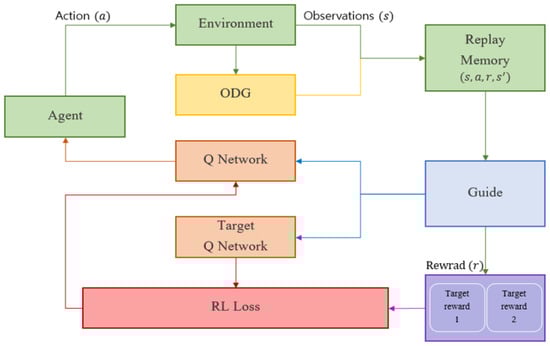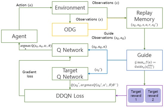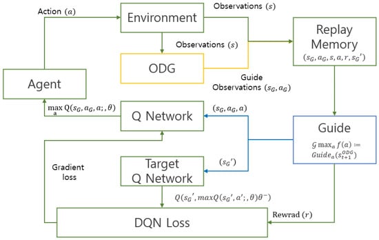 Our proposed solution to these issues is the guide-ODG-DNQ model that integrates SAC with ODG-DQN. This proposed guide-ODG-DQN algorithm transforms the initial Q-value from the state value. This value is extracted from the environment, and it is connected with the ODG formula, which is our prior knowledge, and the LiDAR value extracted with ODG, as depicted in Figure 5. The algorithm extracts a guide action that minimizes the cases where a reward is not received for every state.