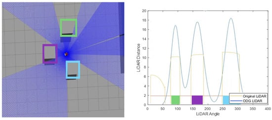 For the implementation of our proposed algorithm to RL using LiDAR information, a standard procedure in autonomous vehicles, we employ ODG-based preprocessed LiDAR information. As demonstrated in Figure 4, the yellow line corresponds to the original LiDAR data, whereas the blue line symbolizes post-processed data. These data include information on obstacle location and size, derived using Equation (5) with ODG [19].