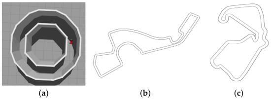 Map environment. (a) Gazebo map; (b) Sochi map; and (c) SILVERSTONE map.