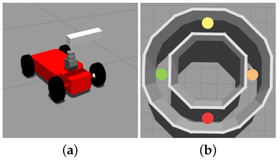 The hyperparameters used in set up are listed in Table 1. The set up is aimed at verifying the efficiency of the algorithm to be applied in a real environment. Therefore, reducing the learning time is the priority. To evaluate whether learning efficiency and stability are ensure, a basic circular map is selected, and a performance comparison experiment is conducted for each RL algorithm: DQN, ODG-DQN, DDQN, and guide-ODG-DQN. The agent model and environment used in the experiment are shown in Figure 8.