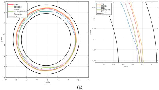Next, to evaluate the stability of the RL results, the center line corresponding to the Gazebo map is applied as a reference. The path generated by each algorithm is shown in Figure 9a. Moreover, Table 5 shows the results obtained by comparing the algorithms in terms of the RMSE, as defined in Equation (16). The RMSE for guide-ODG-DQN is 0.04, corresponding to the highest stability. The guide-ODG-DQN achieves the lowest RMSE, corresponding to the highest stability, as shown in Figure 9c.