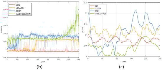 Guide-ODG-DQN and DDQN are compared under the same conditions. Figure 9a shows the results of learning in terms of the epoch values of the safe convergence section for each algorithm implemented 10 times. As indicated in Table 3, the learning convergence rate increases by 51.7%, 89%, and 16.8%, respectively, compared with the other algorithm. Figure 9b shows that the learning is inappropriate due to overestimation in the case of DQN. In the cases of ODG-DQN, DDQN, and guide-ODG-DQN, learning converges at approximately 500, 300, and 200 epochs, respectively the results are summarized in Table 4.