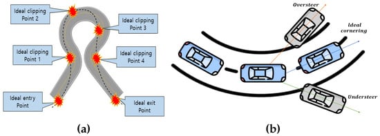 Corner driving: (a) clipping point; and (b) understeer and oversteer.