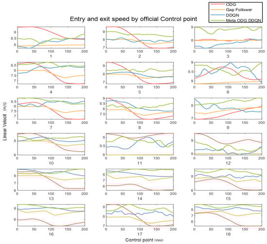 The agent starts at the wall of control point 1. Linear velocity graphs for ODG, Gap Follower, DDQN, and meta ODG DDQN are shown in Figure 13. In this case, 100 points on the x-axis are used as control points, and 100-step linear velocity values are output on both sides based on these values.