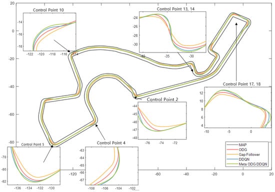 As shown in Table 9, ODG selects a drive with a 13.9% speed reduction. The racing algorithm, Gap Follower, uses an out-in-out driving method with a 3.41% deceleration. However, the DDQN and meta ODG DDQN algorithms lead to oversteer to achieve maximum speed based on the angle extracted from the ODG, which pursues stability, causing the vehicle to spin inward compared to the expected route. So, DDQN and meta ODG DDQN show a driving method without deceleration at control points of 1.33% and 0.46%, respectively, by drawing a path.