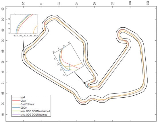 Linear velocity graphs for ODG, Gap Follower, DDQN, and meta ODG DDQN are shown in Figure 13; using the control point specified in the actual Sochi Circuit, we compare the path in the winding road and hairpin curve, as shown in Figure 14.