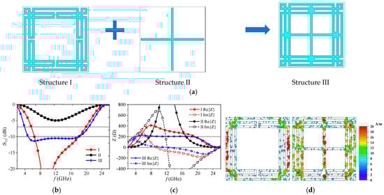To achieve a broadband, angle-stable, and polarization-insensitive FSS absorber, the unit cell pattern must possess characteristics such as miniaturization, 90-degree rotational symmetry, and diverse current paths for multiple resonances in a wide frequency range. Therefore, a folded square ring derived from a one-order Chinese knot combined with a cross was employed as the initial FSS unit cell (shown in Figure 2a). The reflection coefficient and input impedance of the absorber composed of the initial FSS and a grounded PMI foam with thickness of 5.5 mm were simulated using commercial software CST 2019 [20], and the results are illustrated in Figure 2b,c, respectively. The absorption rate can be given as