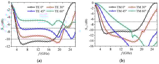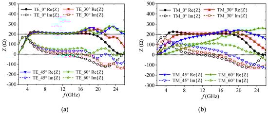 Figure 3 provides the reflection coefficient of the absorber composed of FSS structure III at different incident angles (θ). In the case of TE polarization, as the incident angle θ increases, the reflection coefficient also increased, accompanied by a slight shift in the frequency band, as shown in Figure 3a. However, for TM polarization, the −10 dB bandwidth significantly shifted to higher frequencies, as depicted in Figure 3b. This shift was caused by the changes in both the input impedance and wave impedance in free space, which became 377 Ω/cosθ for TE and 377 Ω·cosθ for TM polarizations, respectively [21]. For TE polarization, the input impedance remained almost unchanged in terms of its real part with respect to the incident angle θ in the frequency range below 16 GHz. However, its imaginary part gradually increased, as shown in Figure 4a, leading to an increase in the reflection coefficient. On the other hand, for TM polarization, both the real and imaginary parts of the input impedance varied with the incident angle θ, but in an opposite manner in the frequency range below 18 GHz, as illustrated in Figure 4b.