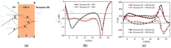 where λ0 is the center frequency of the interested band, and εr is the relative dielectric constant of the slab. Here, a FR4 substrate was chosen as the compensation slab, with an interested frequency band of (4.0–24.0) GHz. Thus, the thickness of the slab was calculated as hs = 2.75 mm, but for fabrication tolerance and overall thickness consideration, a 2.5 mm-thick FR4 slab was used as the compensation layer. However, when the compensation layer was introduced, the reflection coefficient of the FSS absorber (shown in Figure 5b) became larger than −10 dB in the frequency range from 10.1 GHz to 19.6 GHz, resulting in a degradation in absorption. This was due to the fact that the real part of the input impedance dropped below 200 Ω in this frequency range, while the imaginary part only underwent a slight change, as depicted in Figure 5c.