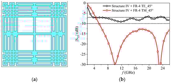 To tackle this problem, the real part of the input impedance should be increased. The effective resistance of a resistive film FSS depends on factors such as the unit cell pattern, sheet resistance, and current distribution. Since the impedance matched well outside the frequency range of 10.1–19.6 GHz, a better option for improving impedance matching within this band was to alter the unit cell pattern and, consequently, the current distribution. Therefore, the one-order Chinese knot in the FSS unit cell was modified to a second-order Chinese knot, while the other configuration remains the same (structure IV), as shown in Figure 6a. The reflection coefficient and input impedance of the modified FSS absorber (structure IV + FR4) are presented in Figure 5b,c, respectively. It is evident that the impedance matches well in the frequency range of 3.4–22.0 GHz (146.4%), except for around 6.5 GHz. However, when the incident angle increased to 45°, the reflection coefficient for TE polarization increased beyond −7.0 dB around 20.3 GHz, as illustrated in Figure 6b, thereby reducing the absorption bandwidth of the absorber.