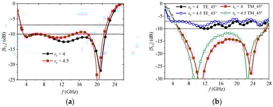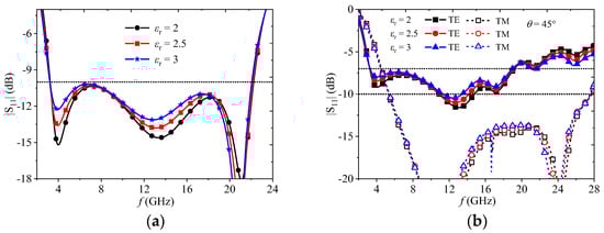 Without changing the thickness of the compensation layer, only varying the dielectric constant of the compensation slab did not effectively solve these problems, as revealed by Figure 7a,b. Instead, splitting the compensation layer into two slabs with different thickness and dielectric constant was explored, which could introduce additional reflections that cancel each other at the interface of the absorber. By employing a FR4 substrate with a thickness of 1.5 mm as one slab, the dielectric constant of another slab with a thickness of 1 mm was determined by a parameter sweep, and the results are provided in Figure 8a,b. It revealed that a substrate with a dielectric constant of 2.5 can meet the requirements of a broad bandwidth and angular stability. Thus, the PMMA material was chosen as another slab for compensation layer.