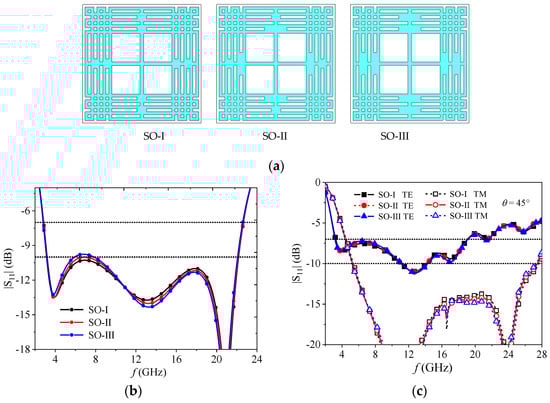 The rectangular patches formed where the second-order Chinese knot meet the cross. The effects of these patches dimension size on the absorber were investigated. Three cases with different patches are depicted in Figure 9a. All of the patches in structures SO-I and SO-III had the same dimension size, while the dimension size of the patches in structure SO-II were different. The results in Figure 9b,c reveal that the patches with different dimension sizes improved the impedance matching around 6.5 GHz and slightly shifted the upper cutoff frequency higher.