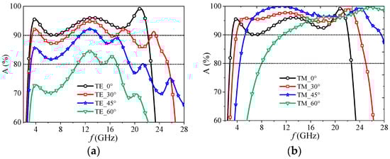 Achieving incident angle stability and polarization insensitivity is crucial for the design of an effective microwave absorber. It is important to consider that electromagnetic waves can approach the absorber from various directions. Figure 10 shows the effect of different incidence angles on the absorptivity of the absorber in TE and TM polarization modes. At normal incidence, the proposed FSS absorber demonstrated exceptional performance, achieving over 90% wave absorption within the frequency range of 3.1–22.1 GHz, with a relative bandwidth of 150.8% for both TE and TM polarizations. Further highlighting its robustness, the absorber maintained an absorptivity of more than 80% within the frequency range of 4.4–19.1 GHz, even under 45° oblique incidence, for both polarizations. In particular, for TM polarization waves, the absorber showed an absorption angle stability of 80% at up to 60°, while maintaining the bandwidth from 8.0 to 22.6 GHz. These results clearly demonstrate that the proposed absorber achieves excellent incident angle stability and polarization insensitivity across an ultrawide frequency range. It effectively absorbs incident waves regardless of the direction and polarization, making it highly suitable for diverse microwave applications.
