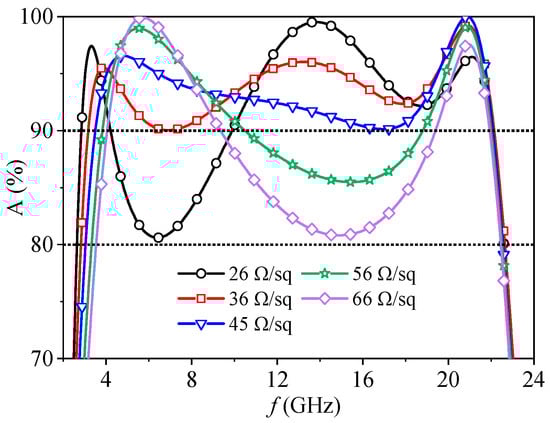 Taking into account the inherent uncertainty associated with the sheet resistance (Rs) of a physical ITO material, which may vary due to processing and fabrication, its impact on the absorption rate was investigated, and results are shown in Figure 11. As the sheet resistance decreased from 36 Ω/sq to 26 Ω/sq, the absorption rate experienced a decline, falling below 90% but remaining above 80% within the frequency range of 4.2–9.9 GHz. However, it is important to note that the absorber maintained its exceptional performance, consistently achieving over 90% absorption beyond this band. Conversely, increasing the square resistance from 36 Ω/sq to 45 Ω/sq had a minimal effect on the absorber’s 90% absorption bandwidth, which remained nearly unchanged. The remarkable characteristics of the proposed absorber lies in its ability to sustain at least 80% absorption even when confronted with significant sheet resistance fluctuations, ranging from 26 Ω/sq to 66 Ω/sq, across an ultrawide band spanning from 3.5 GHz to 22.4 GHz. This attribute holds remarkable importance in resistive film absorber design, as resistive film fabrication often leads to notable variations in sheet resistance within a relatively large range [22].