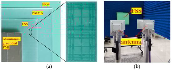 To experimentally verify the absorber design, a prototype of 29 × 29 cells with dimensions of 300 mm × 300 mm × 8.21 mm was fabricated, as shown in Figure 12a. The measurement was conducted in an anechoic chamber, in accordance with the method described in [23], and the measurement setup is shown in Figure 12b. Two groups of wideband horn antennas were used to transmit and receive the signal. Those antennas were placed 1.5 m away from the absorber. The S-parameters were measured by an Agilent E8363C vector network analyzer.
