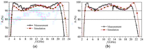 The measured absorption rate in comparison with the simulation for normal incidence is illustrated in Figure 13a,b. Good agreements are observed between them. The measured 90% absorption bandwidth was 3.1–21.1 GHz with good polarization independence. The bandwidth shrinks by approximately 1.0 GHz more at a high frequency than the design, mainly due to the fabrication tolerance.