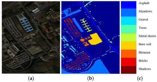 PaviaU dataset: (a) pseudo-color image, (b) class diagram of real features, (c) category labels.