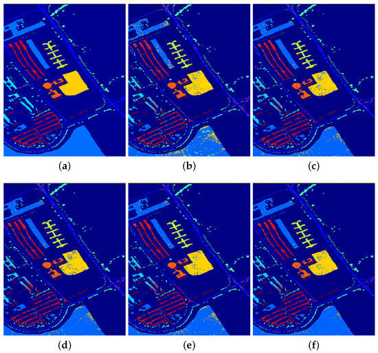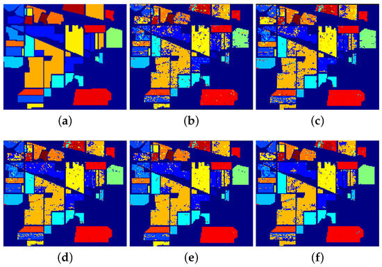 In the experiments, the selection of the number of neighbors, denoted by k, was set to 7. Specific parameter settings were used for each dataset, where , for the Indian Pines dataset; for the Salinas dataset; and for the PaviaU dataset. For the Indian Pines dataset, 10% of the data were used for training, with the remaining data serving as the test samples. Similarly, for the Salinas dataset, 5% of the data were allocated for training, and for the PaviaU dataset, 10% of the data were used as the training samples. The chosen partitioning strategy was selected to directly reflect the scarcity of labeled hyperspectral data in a real scenario. For each dataset, we dedicated a significant portion to the testing set while allocating a comparatively smaller proportion for training. This deliberate division allows us to effectively assess and validate the performance of the proposed method, even when operating with a restricted number of training samples.