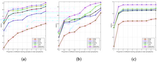 In order to examine the impact of the GSSCRC algorithm, as well as that of the SVM, SRC, KSRC, and JCR algorithms, on the overall classification results with varying numbers of training samples, this study conducts experiments on three datasets to assess the influence of different training sample sizes. For the Indian Pines dataset, the selected training sample proportions range from 1% to 10%, with the remaining samples being used as the test sample set. Similarly, for the Salinas dataset, the proportions range from 0.2% to 5%, and for the PaviaU dataset, the proportions range from 1% to 10%. The effect of different training sample sizes on the classification performance is depicted in Figure 8.