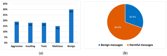 Distribution of messages (a) based on the categories; (b) benign and harmful.