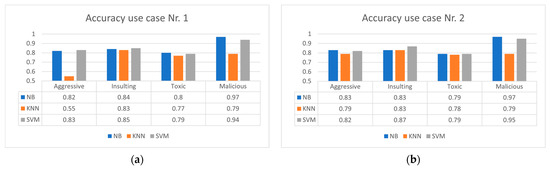 In the third scenario use case, the SVM method achieves the best accuracy (1–3%), outperforming NB for aggressive, insulting, and toxic messages. In the fourth scenario use case, the SVM method similarly achieves the best accuracy (1–5%), outperforming NB, and only for malicious messages the NB method 3% outperforms the SVM method.