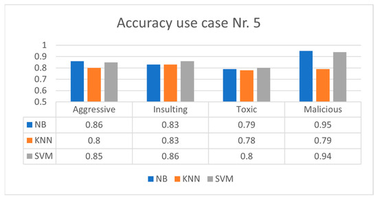 The NB and SVM methods perform nearly similarly in the fifth scenario use case but show the best accuracy across all classes. For aggressive message recognition, the fifth scenario use case performs the best in terms of classification accuracy. The recognition of an insulting message works best in the second scenario use case. The ability to recognize toxic messages is best in the third scenario use case. The optimum scenario use case for identifying malicious messages is the fourth one.